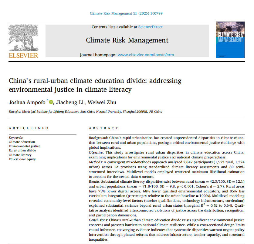 Recently, Joshua Ampofo, Jiacheng Li, and Weiwei Zhu from the Shanghai Municipal Institute for Lifelong Education, East China Normal University, published a research article titled "China's rural-urban climate education divide: addressing environmental justice in climate literacy" in the SSCI-indexed journal Climate Risk Management.