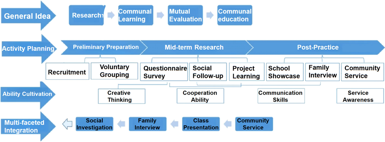 Thirdly, boundaries between disciplines should be broken down with an integrated design across multiple subjects that combines cognitive learning with social growth. Problem-solving permeates the entire project-based learning process, as students continuously learn within a series of task frameworks, thinking and exploring like subject experts. Questions like “What is the future trend of climate change in Northeast China?”, “What factors influence climate change?”, “What measures are needed to protect the environment?” and “How can nursing expertise help prevent diseases caused by cold climates in Northeast residents?” are explored. Research-based, practical, and socialized learning fosters the transformation of fragmented multidisciplinary knowledge into a comprehensive force for exploring the world, fostering coherence and holistic understanding in learning and life.