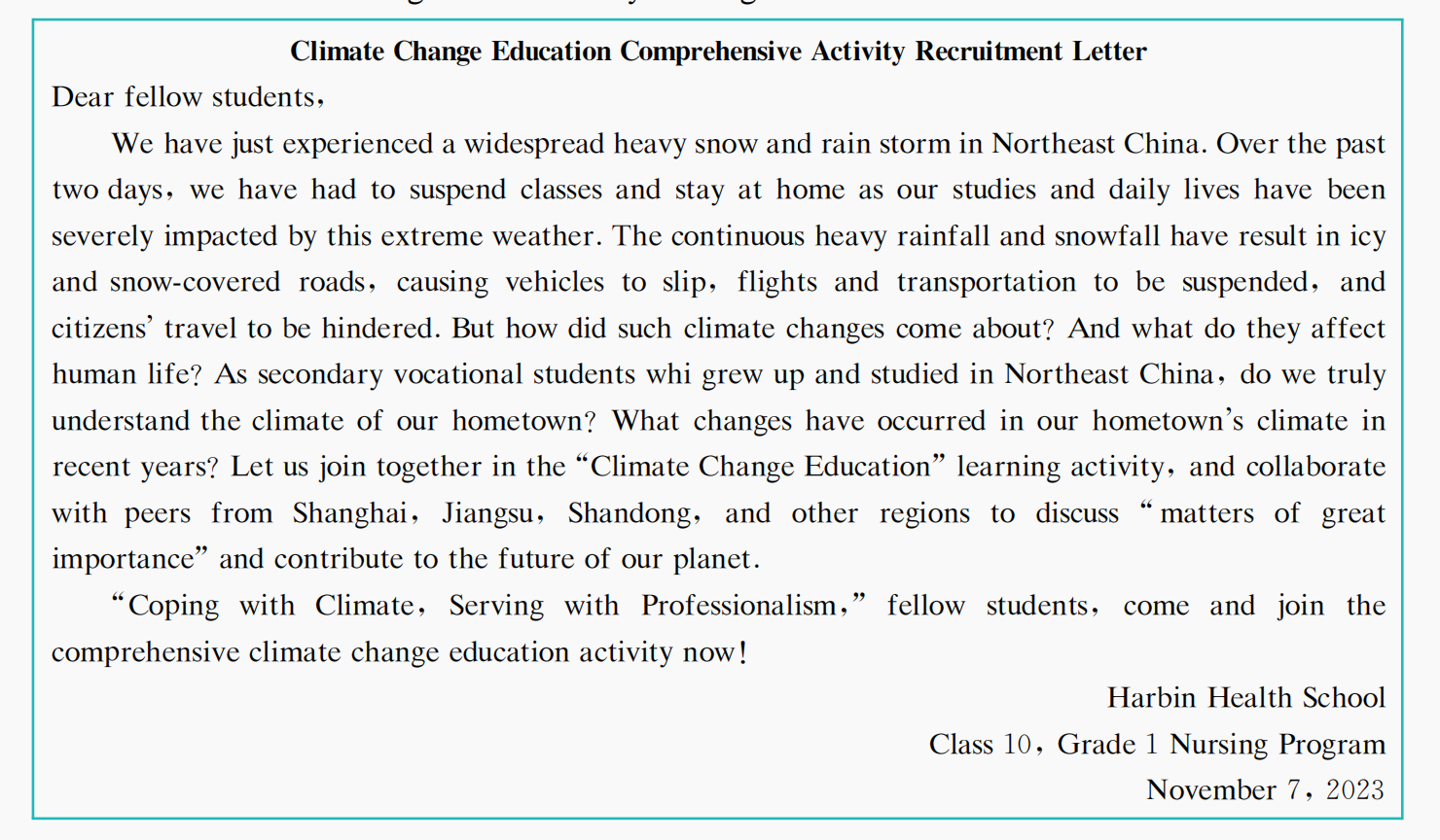 On November 5th, 2023, Northeast China was affected by a widespread heavy snow and rainstorm, resulting in school closures and flight cancellations in multiple regions. Teachers took this opportunity of the recent extreme weather experienced by students to initiate the climate change education by issuing a recruitment notice to all class members.
