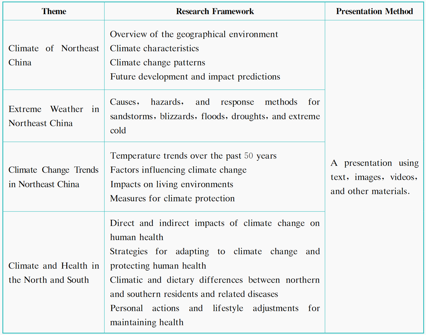 Specific Objectives: To enhance students’ understanding of the current climate change situation in Northeast China and foster their environmental awareness. During the event, students will grasp methods of coping with extreme weather and improve their survival skills. They will also explore the relationship between climate characteristics and diseases, thereby enhancing their professional knowledge.
